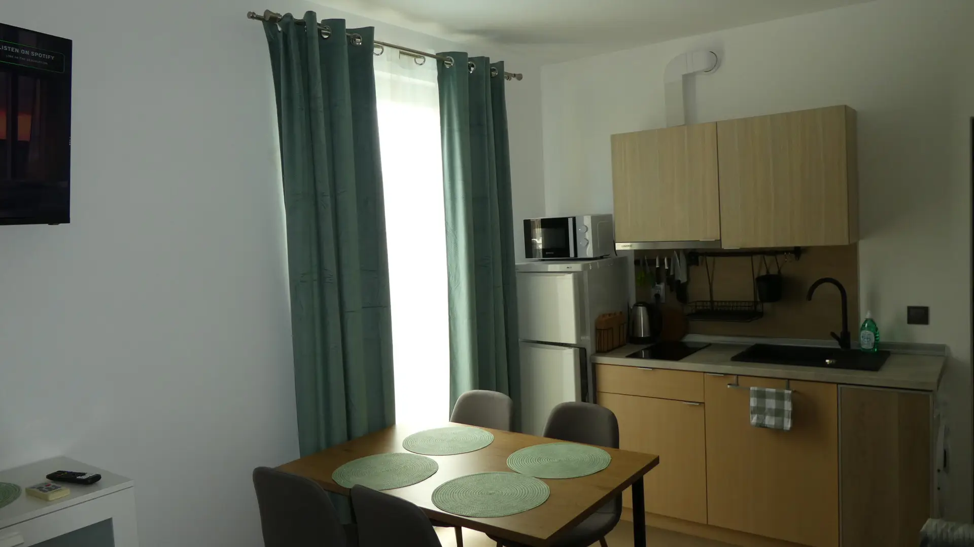 Wszystkie apartamenty wyposażone są we w pełni funkcjonalny aneks kuchenny. Poza kuchnią znajdziesz tam: zlew, lodówkę, komplet naczyń i sztućców.